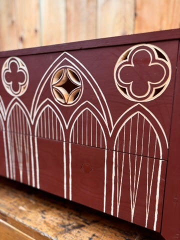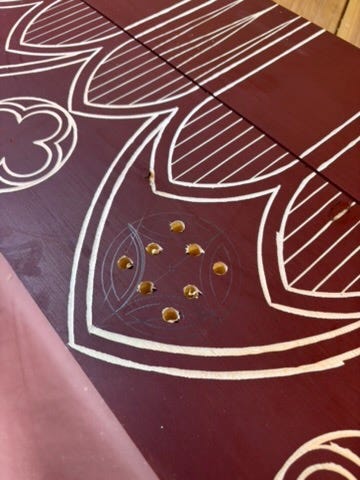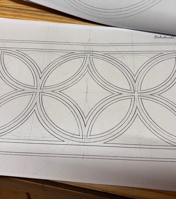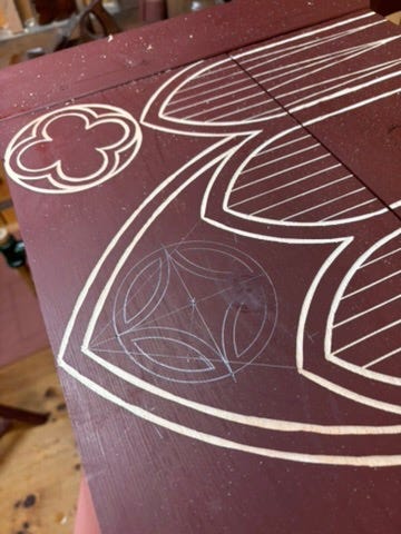 The design I used on my recent blanket chest is not a quatrefoil, but a closely related variation. The image from which I drew my inspiration simply has it labeled “Balustrade”, and which I have termed a “reverse quatrefoil”. It is composed of a series of arcs that all have the same radius (the compass setting never changes), and are swung from the four corners of a square in the opposite direction of a typical quatrefoil: