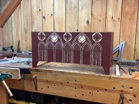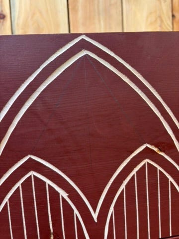 I am usually content to simply engrave the design. This looks great, and is quick to accomplish. For this piece I wanted the effect of a window, so I cut out the waste with a coping saw. I followed this up with a piece of 220 sandpaper on a stick, and chamfered the exterior edges with a chisel at roughly a 45 degree angle.