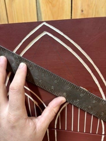 Note: If you are also engraving your design, as I was, it is handy to engrave these lines at the same time you draw them. Because your scribing point is on a popsicle stick, you lose it as soon as the popsicle stick is moved. If you drew all of your lines, and then engraved them, you will effectively be finding each scribing point twice. This is what I did in order to photograph the process, and it took another few minutes to find the points a second time.