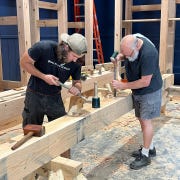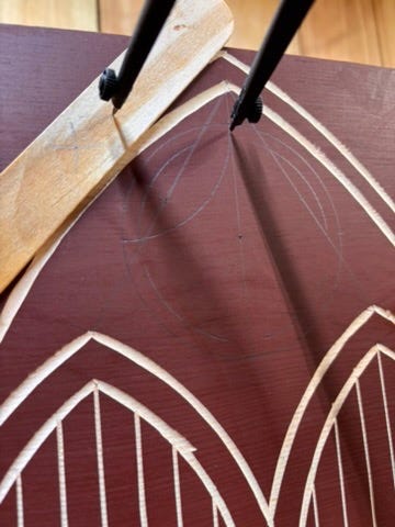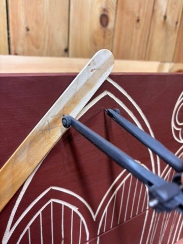 Here is a trick. To prevent leaving prick marks from the compass all over a piece of finished work, I use a small popsicle stick. Lay out the popsicle stick where you expect to find the center point of your new arc. This may involve some trial and error (you can see I made a few marks before getting it right). Once it is in the right position, you can scribe just the intersection of both points. Being careful to keep the popsicle stick in exactly the same position, place the non-pencil end of your compass at the intersection on the stick and swing your arc from there. This puts the compass prick into the popsicle stick, not your work.